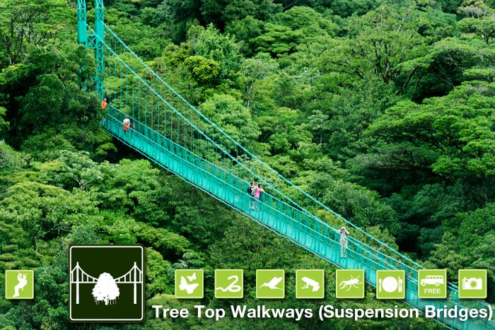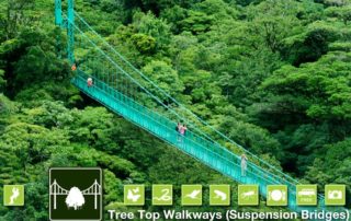 Each bridge has a width of five feet, the widest bridges in Costa Rica, and also a capacity of up to 80 people per bridge making them both the longest and strongest bridge systems in the Monteverde Cloud Forest. The Tree Top Walkways are suitable for people of all ages. The duration of the hike usually takes between 1.5 and 2 hours. Transportation departs for free from any hotel in the Monteverde area!